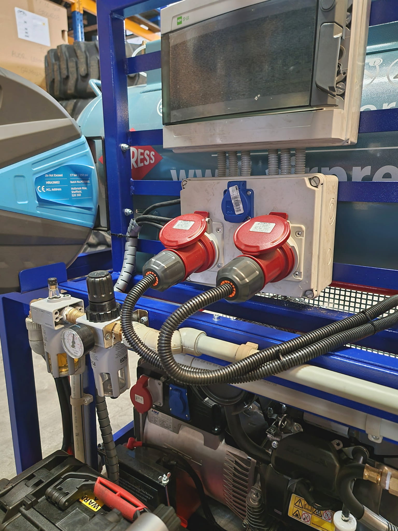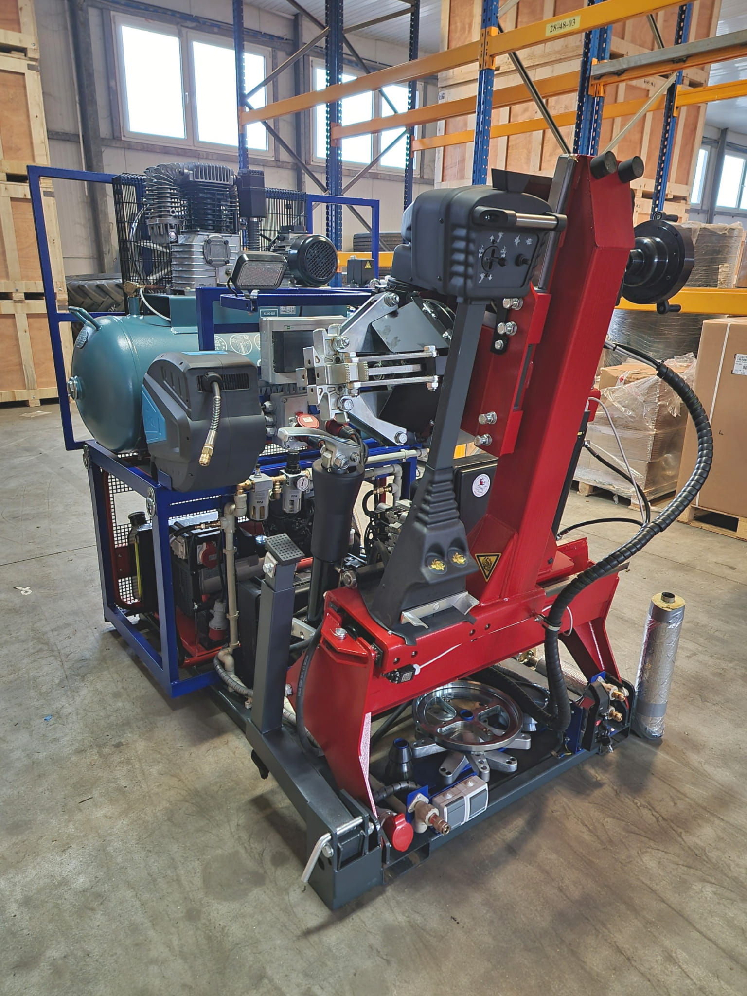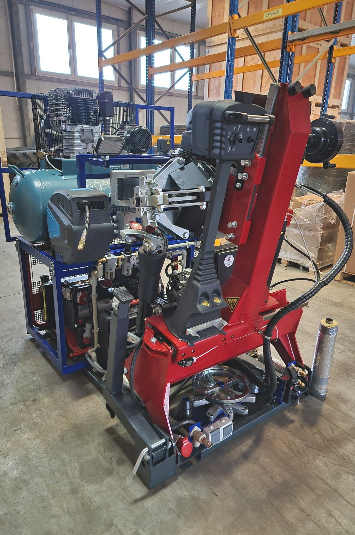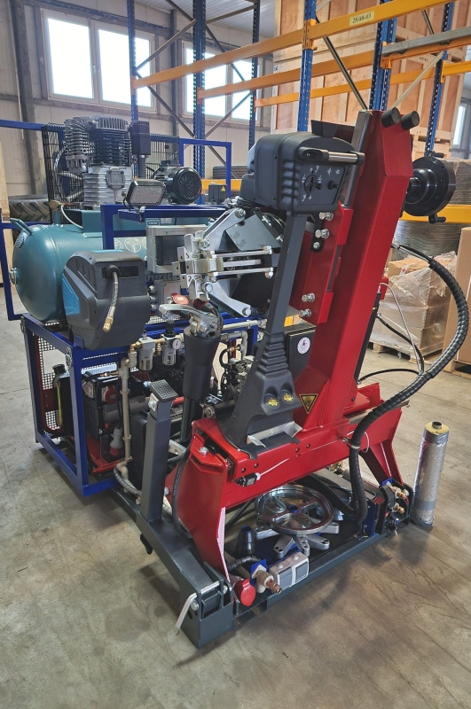 - Kompletny zestaw: Zawiera montażownicę DIDO 26MV, wyważarkę MB200, kompresor, agregat prądotwórczy, oświetlenie halogenowe, zwijadła pneumatyczne, szybkozłącza pneumatyczne oraz gniazda prądowe 3-fazowe i 1-fazowe.